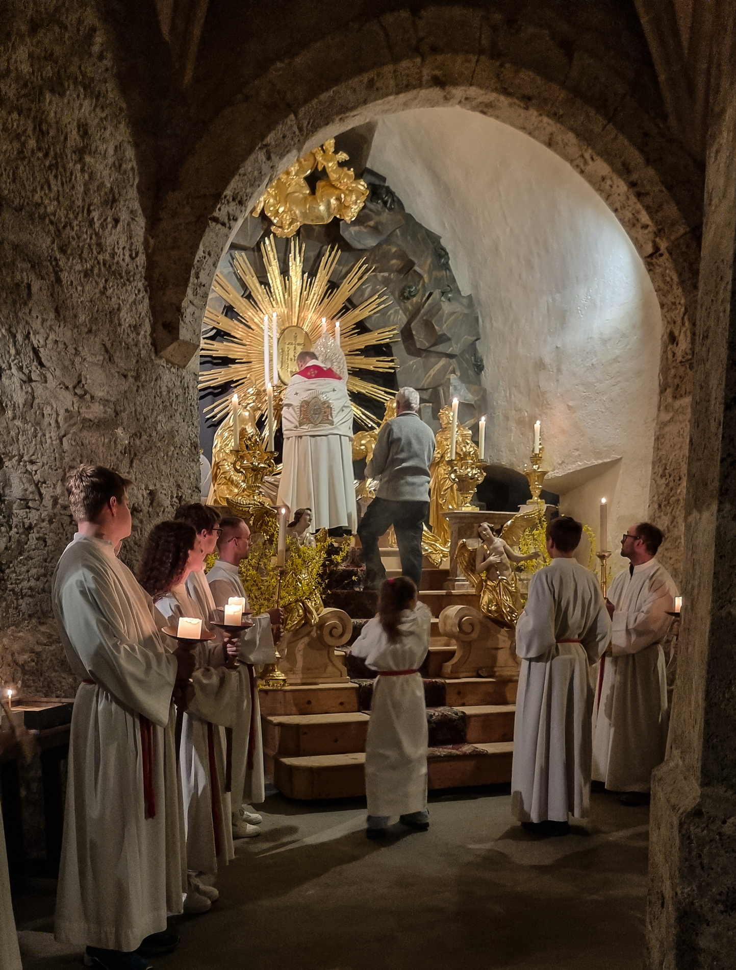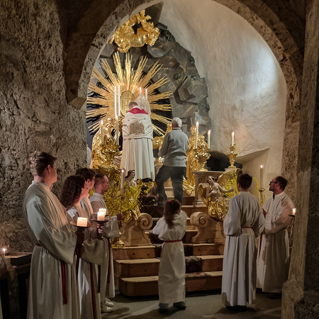 Den Kreuzweg am Karfreitag zur Unteren Buchenbergkapelle mit vielen Gläubigen beteten Jugendliche vor. Die Passion nach Johannes und die „großen“ Fürbitten mündeten in die traditionelle Kreuzverehrung, die den Höhepunkt des Abends bildete. Am Ende der Feier stand die „Grablegung“, eine nächtliche Anbetung, die sich bis Karsamstag 17.00 Uhr fortsetzte. Zahlreiche Gäste aus nah und fern fanden sich ein, um das berühmte hl. Grab zu besuchen.
