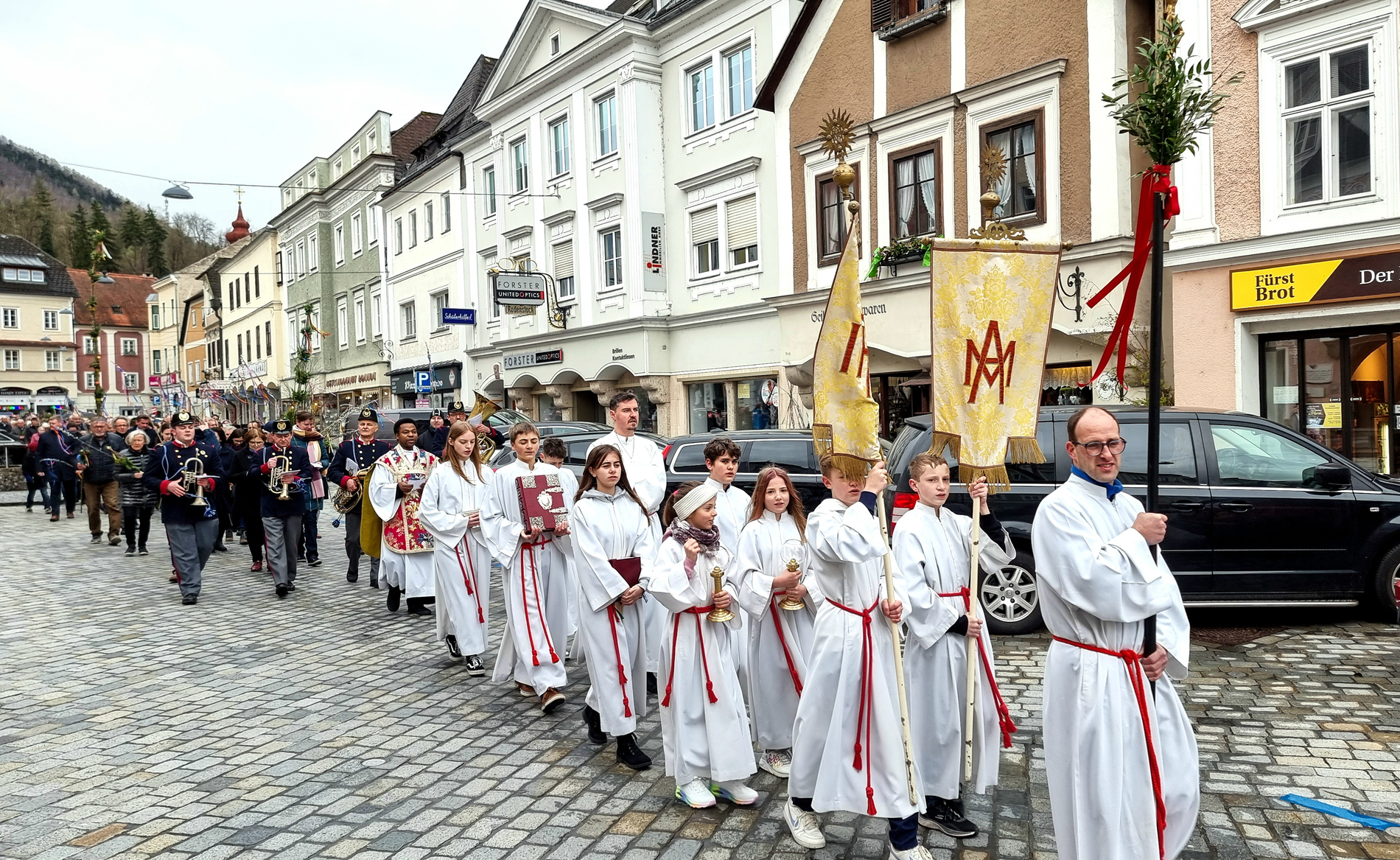 Das Wetter hatte ein Einsehen mit den Gläubigen, und so konnte die Palmweihe bei der Franziskuskirche mit anschließender Palmprozession durch die Stadt in gewohnter Weise stattfinden. Stadtpfarrer Mag. Herbert Döller segnete und verteilte Palmzweige an die Gemeindevertretung mit Bürgermeister Krammer und an die Vertreter der Pfarrgemeinde. Kaplan Samuel leitete den anschließenden Gottesdienst in der Stadtpfarrkirche.