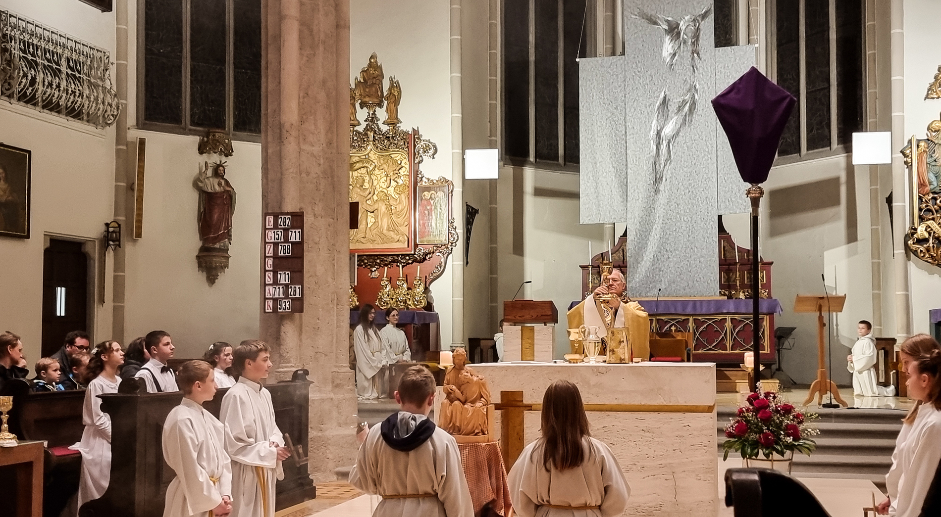 Den Höhepunkt der hl. Messe bildete die Passionsgeschichte, die von den Ministranten in verteilten Rollen gelesen wurde. Im Anschluss lud die Pfarrcaritasgruppe zum Pfarrkaffe für Bischof Schäffler und zum Ostermarkt in den Pfarrhof ein.