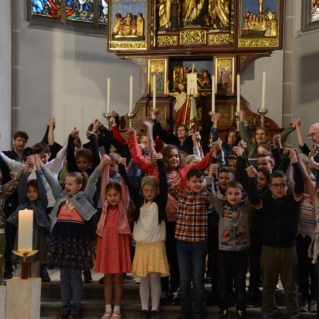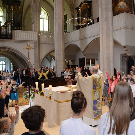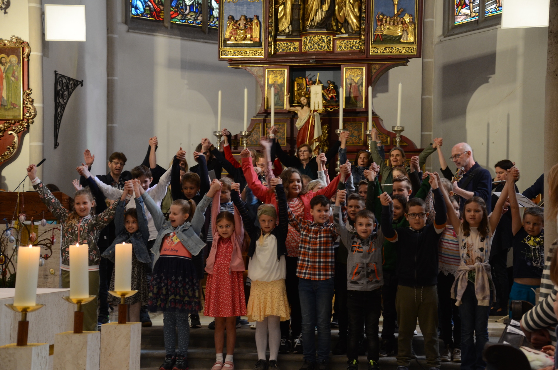 Am vergangenen Sonntag, 14. April, wurden in der Stadtpfarrkirche Waidhofen die diesjährigen Erstkommunionkinder vorgestellt. 30 Volkschülerinnen und Schüler aus Waidhofen werden am 5. Mai das Sakrament der Eucharistie zum ersten Mal empfangen. Bestens vorbereitet durch Religionslehrer Josef Bramauer und unterstützt vom Familienmesschor der Pfarre sowie einigen Lehrern und Schülern, gestalteten die Kinder die hl. Messe musikalisch mit. Bei der Predigt stellten sie sich der Pfarrgemeinde vor und verteilten im Anschluss frohe Botschaften von Gott an die Gottesdienstbesucher.