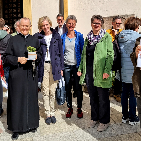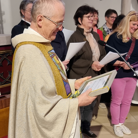 Zahlreiche Gottesdienstbesucher lauschten in der 10.30 Uhr Messe der Messe in F-Dur von Martin Vogt, die das Männerensemble zum Besten gab. Auch die Pfarrbevölkerung stellte sich mit vielen Gratulationen ein.