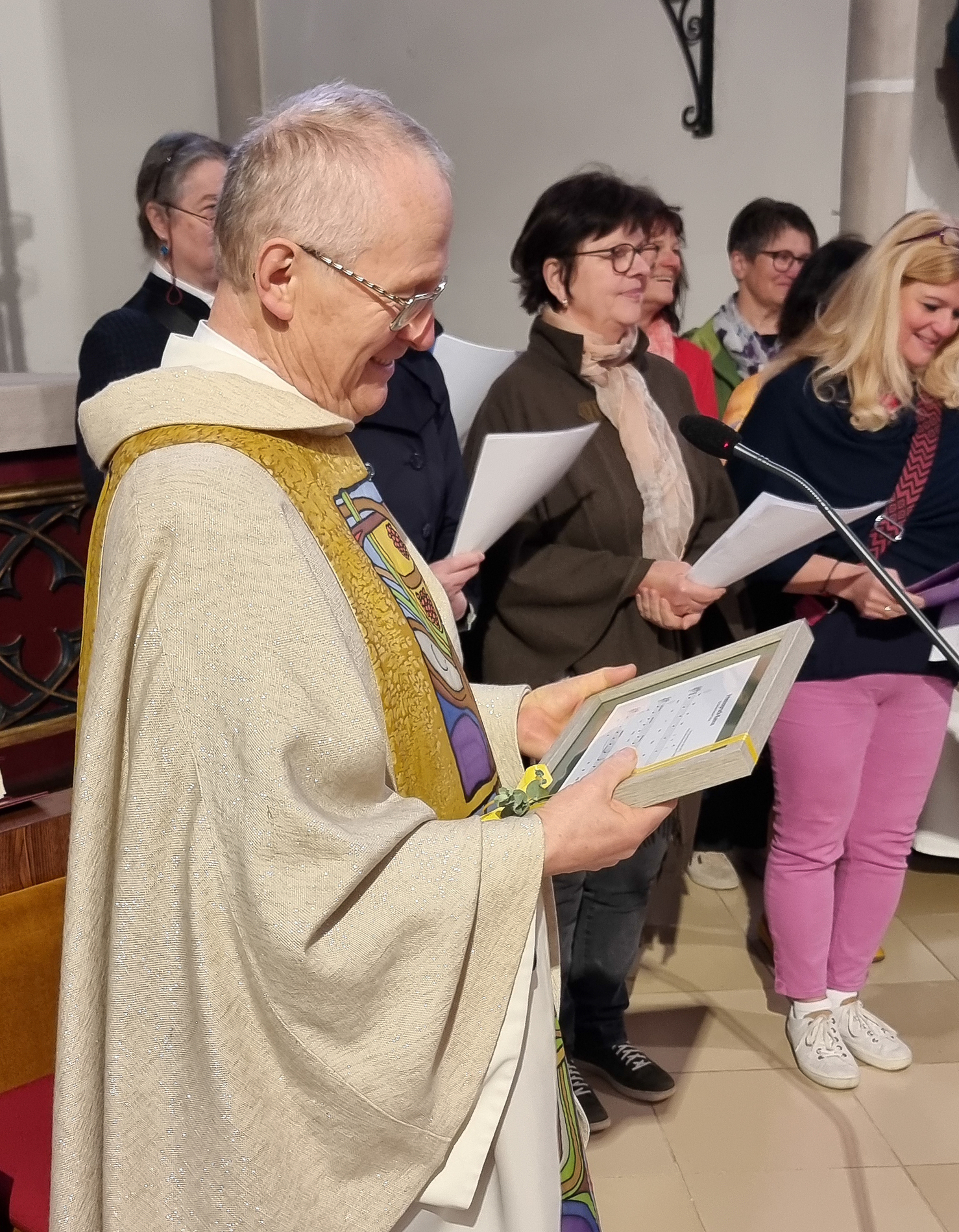 Die Frühmesse vom Lambertichor unter der Leitung von Gundi Leichtfried und die 10.30 Uhr Messe von einem Männerensemble unter der Leitung von Anton Steingruber. Bei der Frühmesse gratulierte der Lambertichor mit einem ganz besonderen Musikstück. Mag. Simon Kreuzpointner, Leiter der Abteilung Kirchenmusik der Diözese St. Pölten, hatte für Pfarrer Döller dessen Primizspruch: „Herr, dir in die Hände sei Anfang und Ende, sei alles gelegt“ vertont und als Kanon gestaltet. Der Kanon wurde hier erstmals gesungen. Die große Freude über das gelungene Geschenk war dem Jubilar anzusehen.