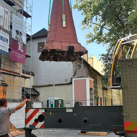 Am Mittwoch letzter Woche konnte man interessante Vorgänge rund um die Franziskuskirche am Graben beobachten. Ein heranfahrender Kran verursachte zwar ein kleines Verkehrschaos, aber er war unbedingt nötig für die Abnahme des alten Turmhelms der Kirche. Nach dem Kreischen der Motorsägen, die die Holzbalken von den Mauerbänken trennten, ging ein Rucken durch den Turmhelm, und er hob sich an den festgezurrten Seilen in die Lüfte. Sorgfältig und sanft schwebte er mit seinen ca. 1300 kg herab und landete punktgenau vor dem Kirchenportal.