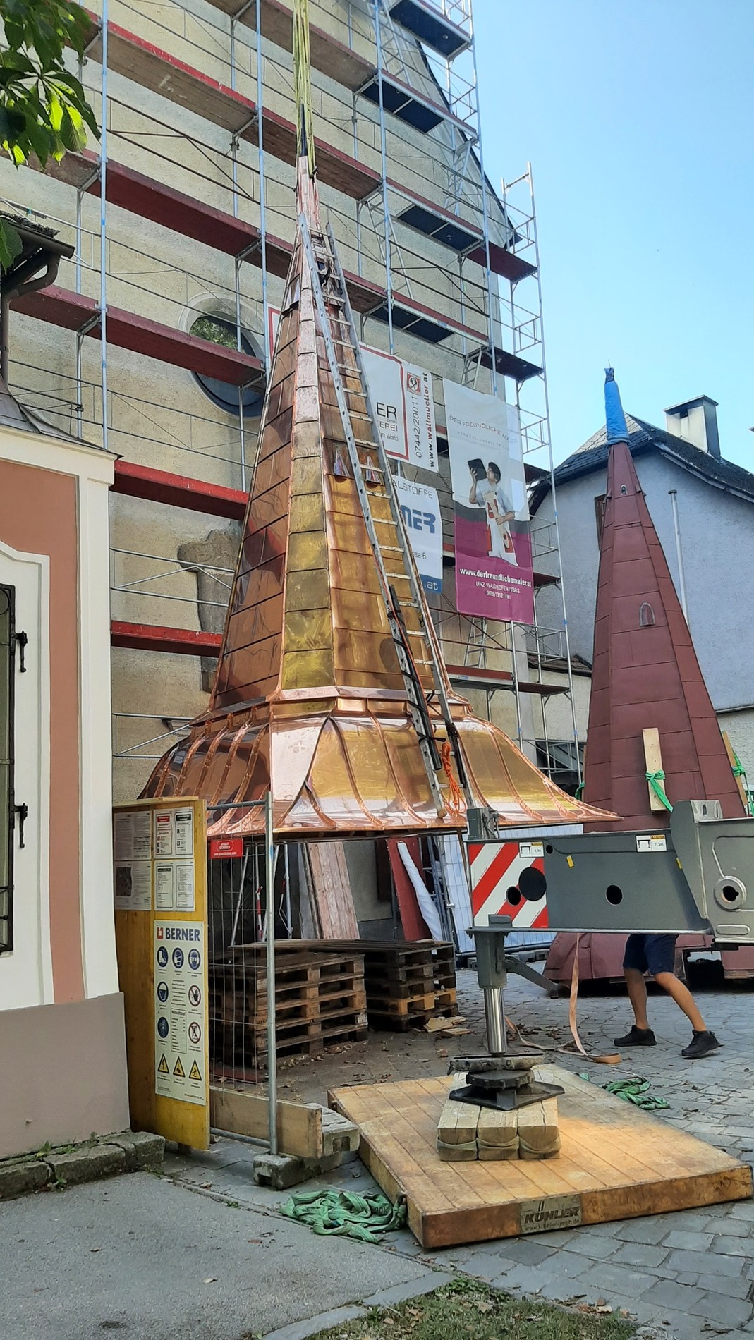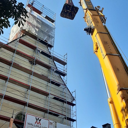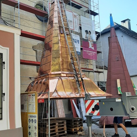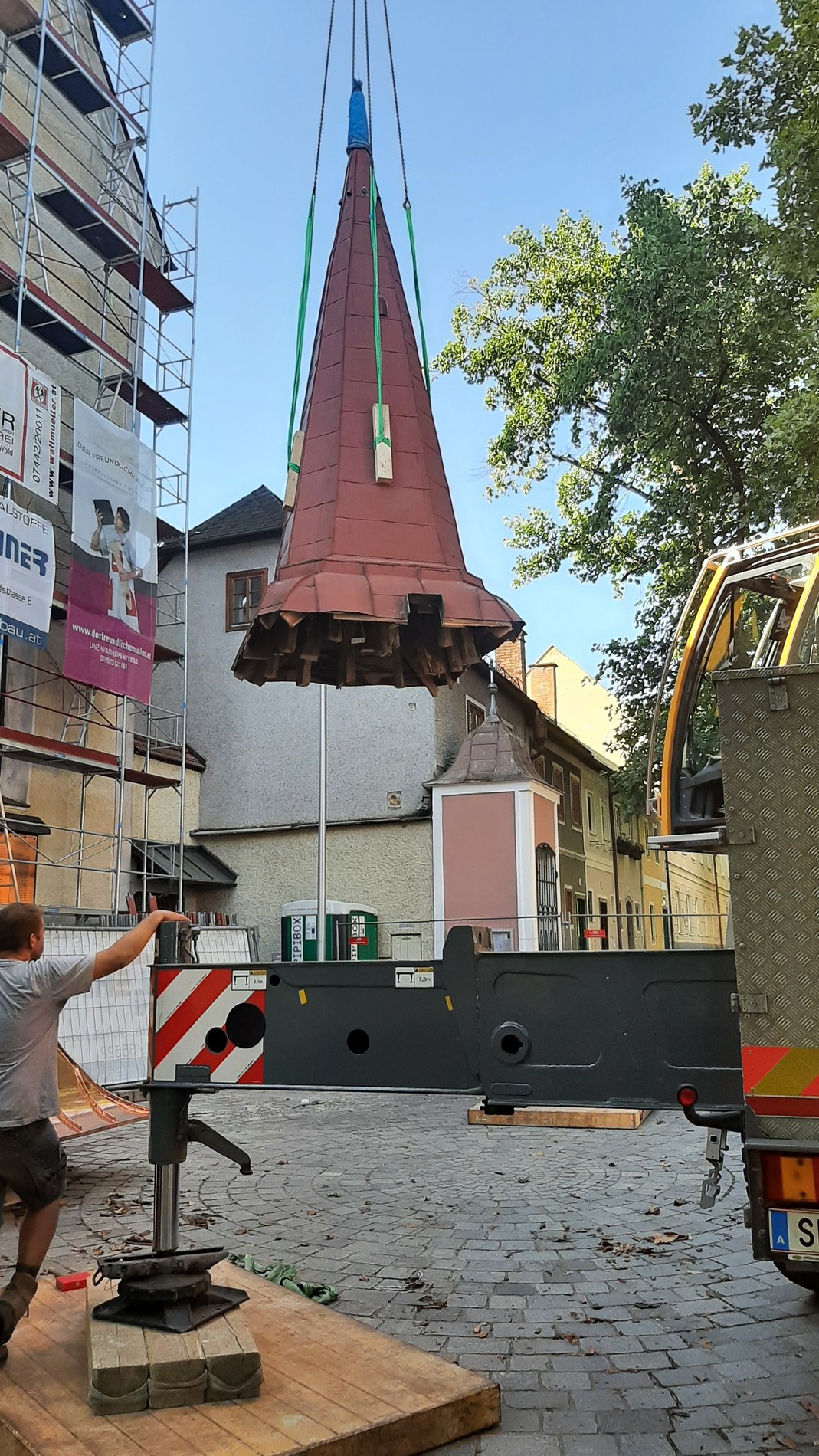 Nur wenig später spielte sich das gleiche Schauspiel in umgekehrter Weise ab: An einer Querstange im Helmbaum hängend, hob der Kran den neuen Turmhelm hoch und setzte ihn an seinem vorgesehenen Platz ab. Nicht nur die Technik des Kranführers sondern auch das ausgeklügelte Zusammenspiel der Fa. Wallmüller und der Fa. Zambelli und deren handwerkliches Können machte den Wechsel in derart kurzer Zeit möglich. Man kann nur wünschen, dass dieser neue Helm zumindest ebenso lang Bestand hat wie der alte.