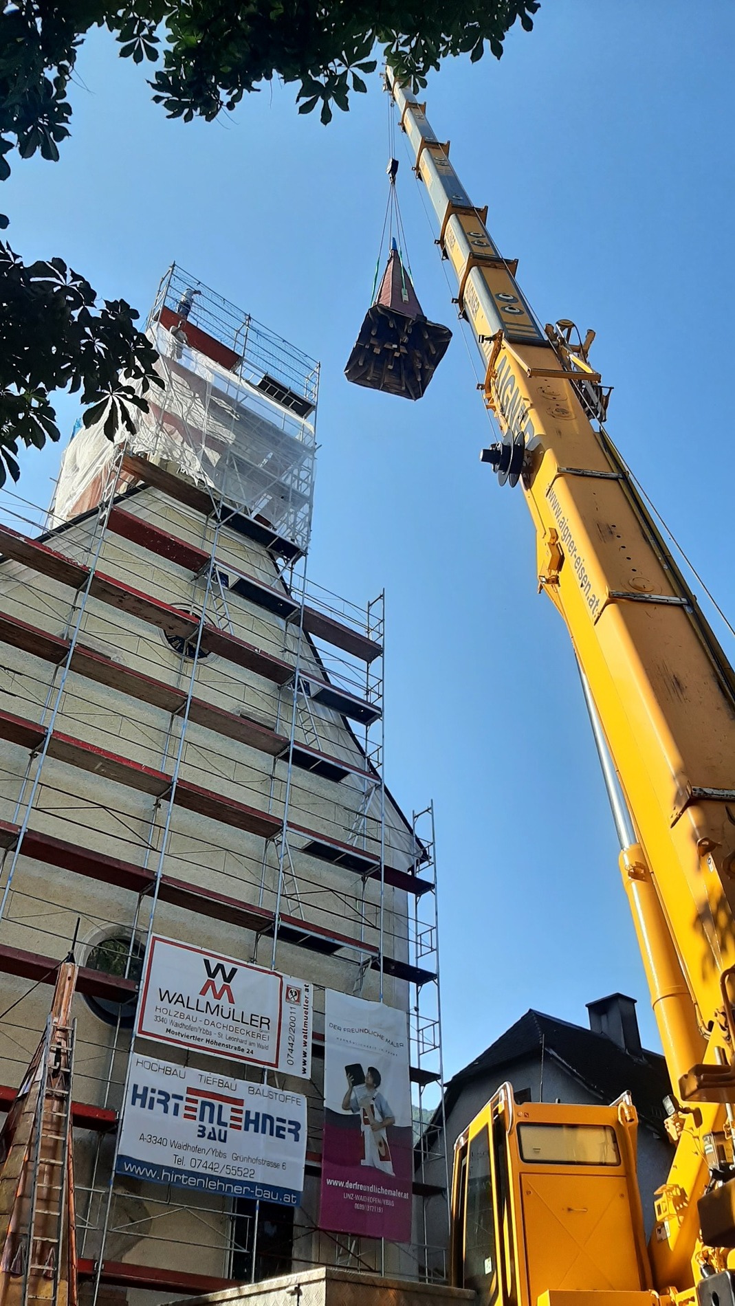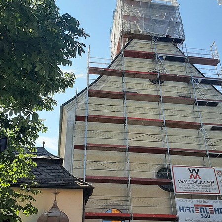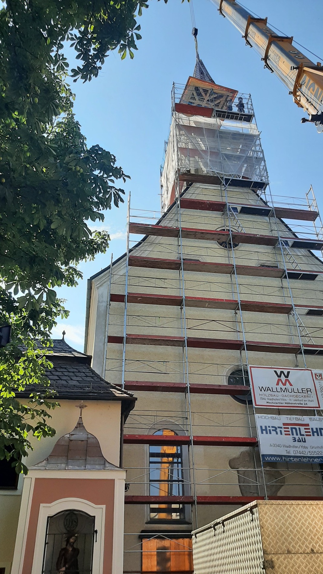 Nun sind die Maler an der Reihe um die Fassade zu färbeln und dann fehlt nur mehr das Kreuz, das den Turm bekrönt.