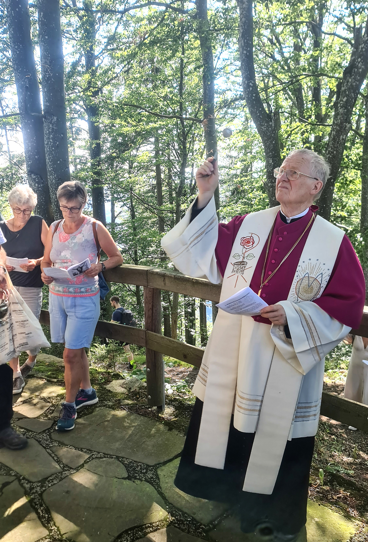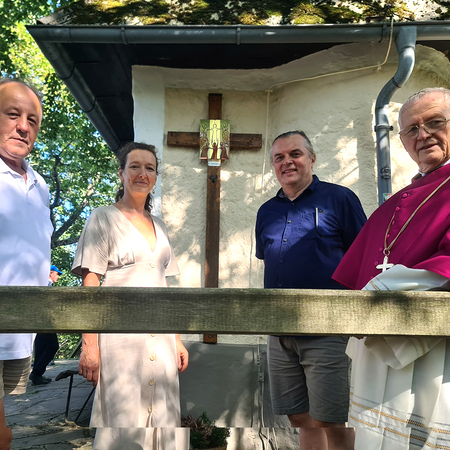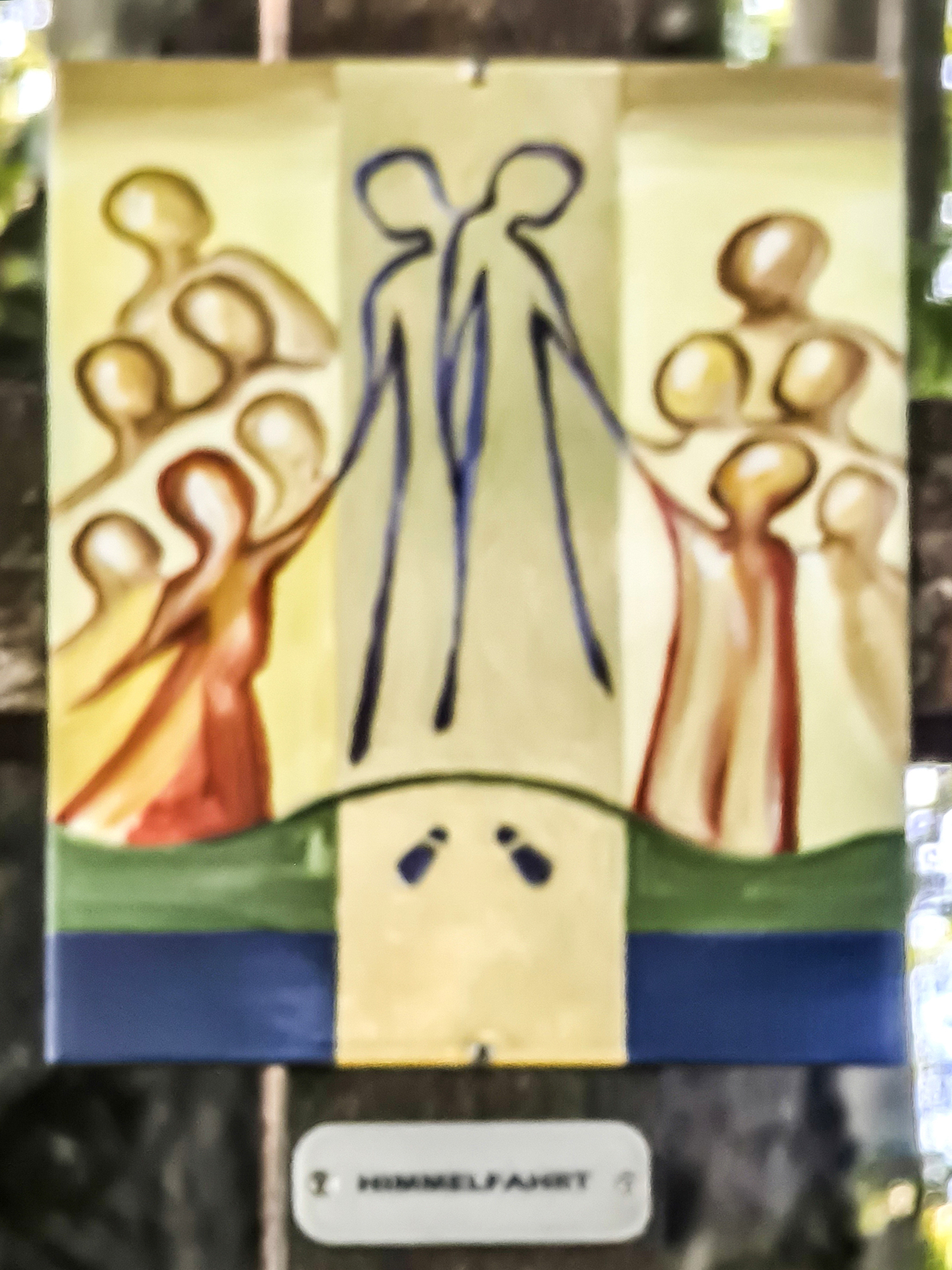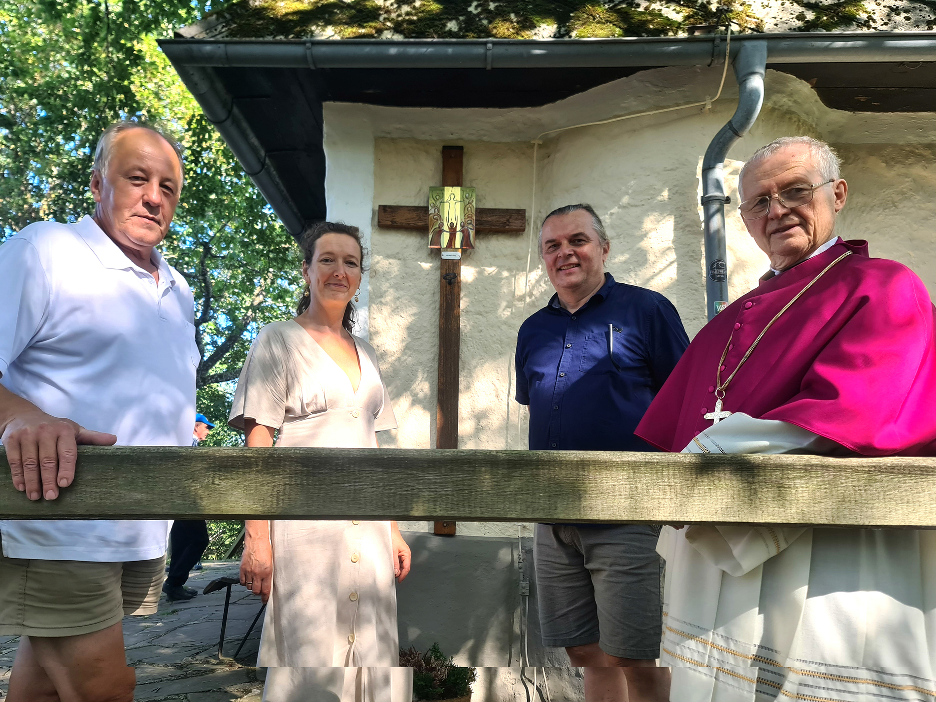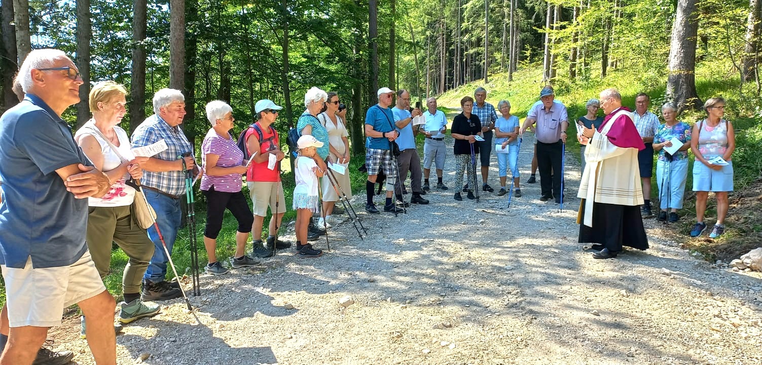Am Marienfeiertag zogen etwa 40 Teilnehmer den Weg hinauf zur Oberen Kapelle der „Sieben Freuden Marias“ und Stadtpfarrer Msgr. Döller segnete im Beisein des Künstlers und von StR Franz Sommer die Kreuze und Bilder.