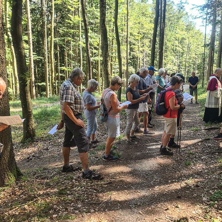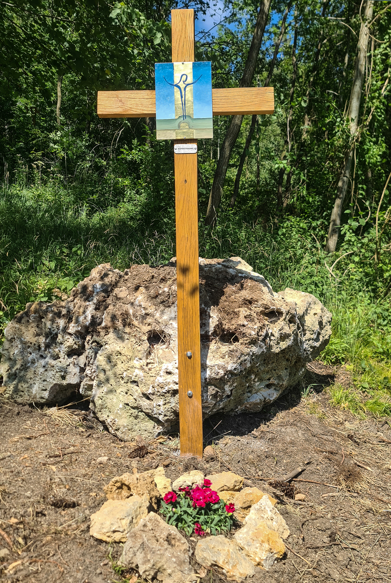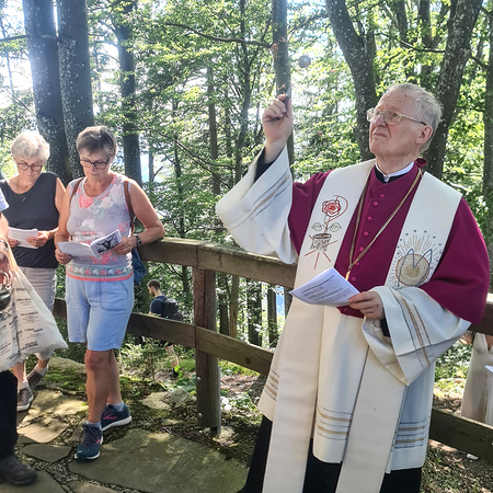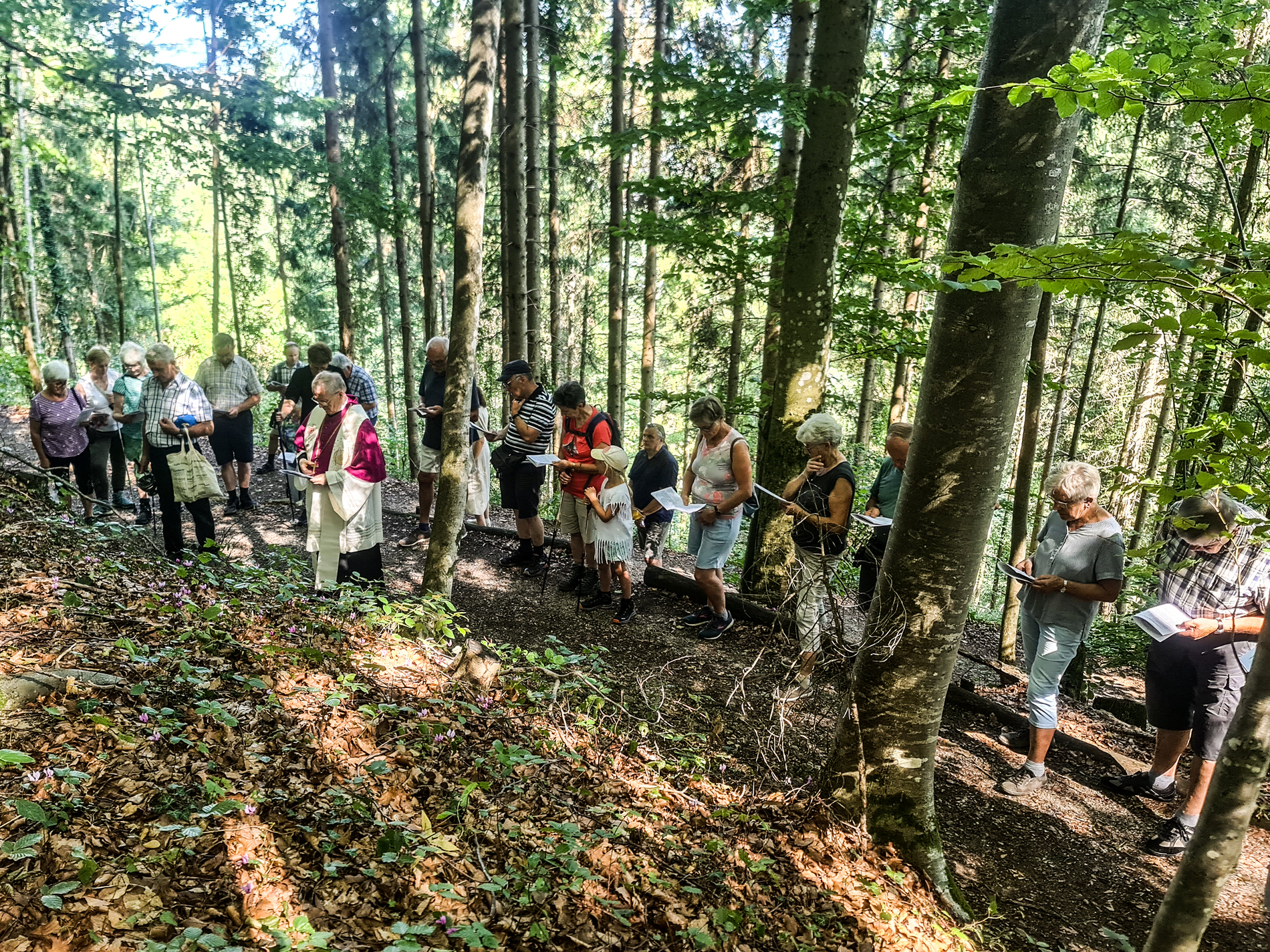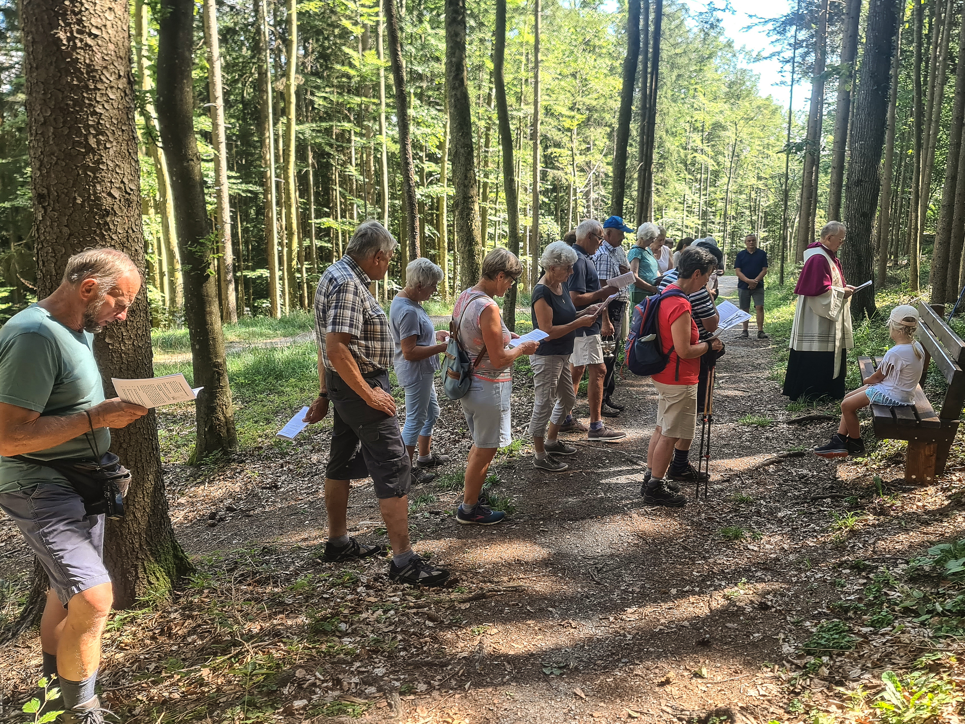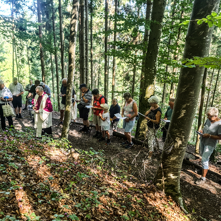 Am Marienfeiertag zogen etwa 40 Teilnehmer den Weg hinauf zur Oberen Kapelle der „Sieben Freuden Marias“ und Stadtpfarrer Msgr. Döller segnete im Beisein des Künstlers und von StR Franz Sommer die Kreuze und Bilder.