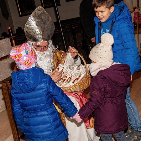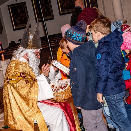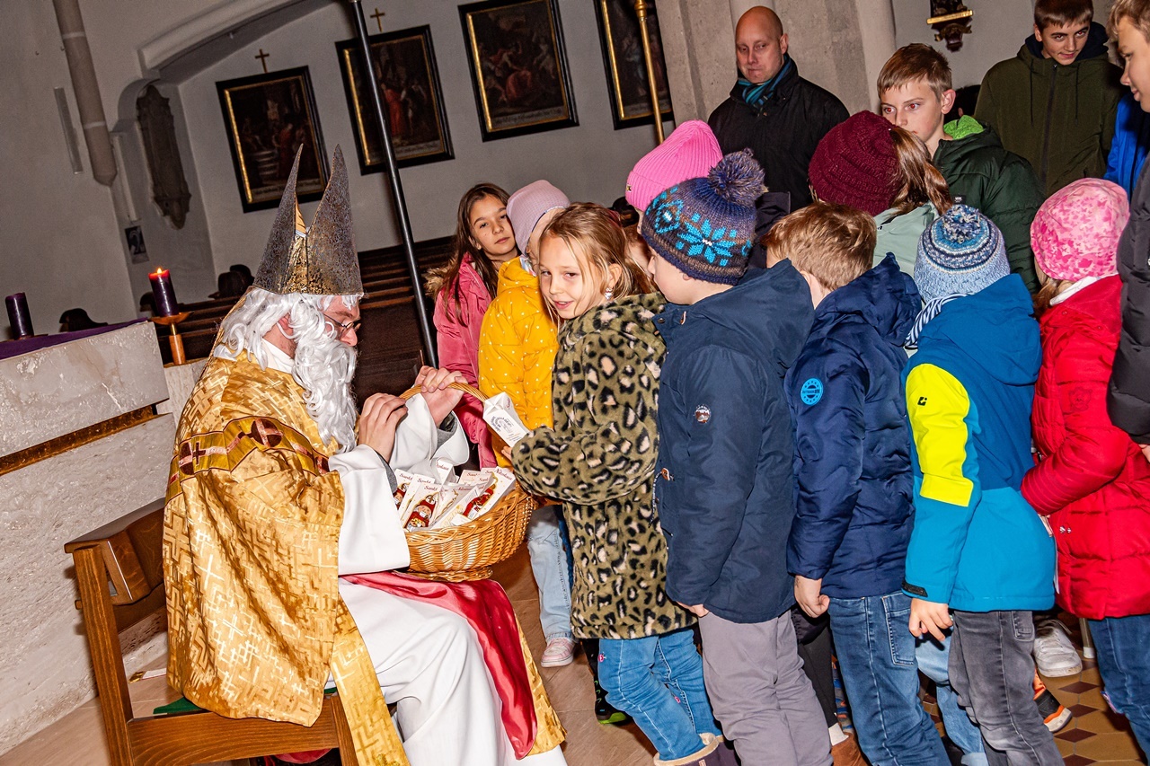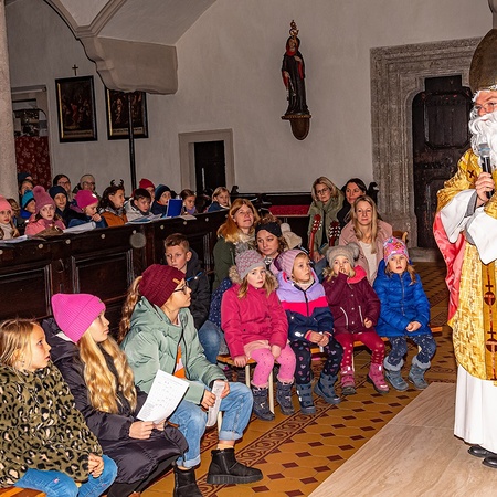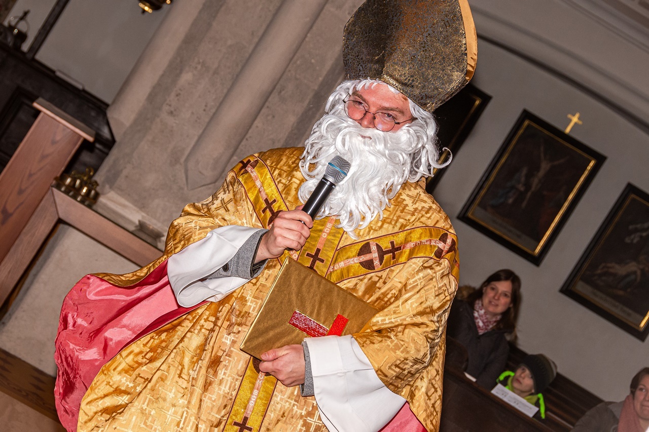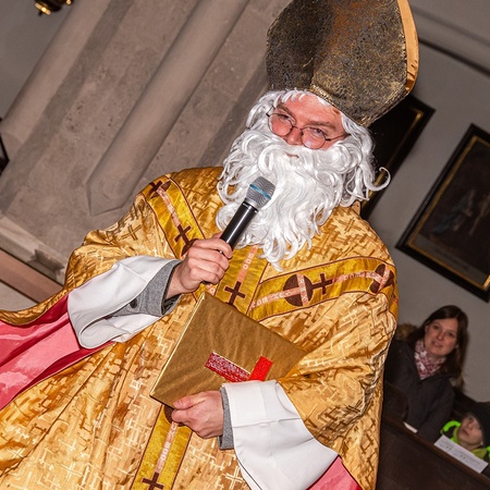 Das Familienmessteam der Pfarre, rund um Pastoralassistent Andreas Stockinger-Wadsak, hatte zur traditionellen Nikolausfeier eingeladen. Als es nun endlich an der Tür klopfte, wurde es ganz still und alle schauten auf den Mann, der im bischöflichem Gewand, mit Mitra und Stab in die Mitte trat.