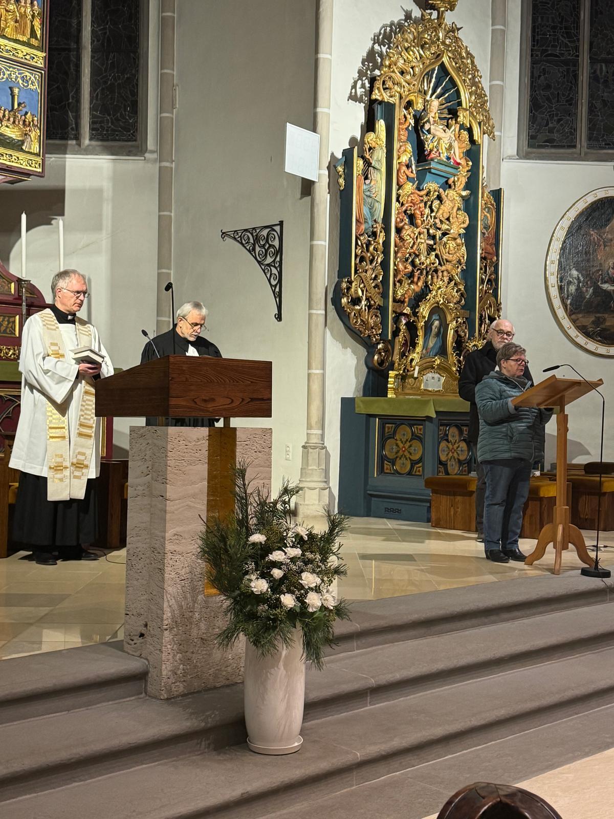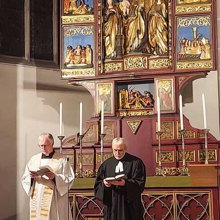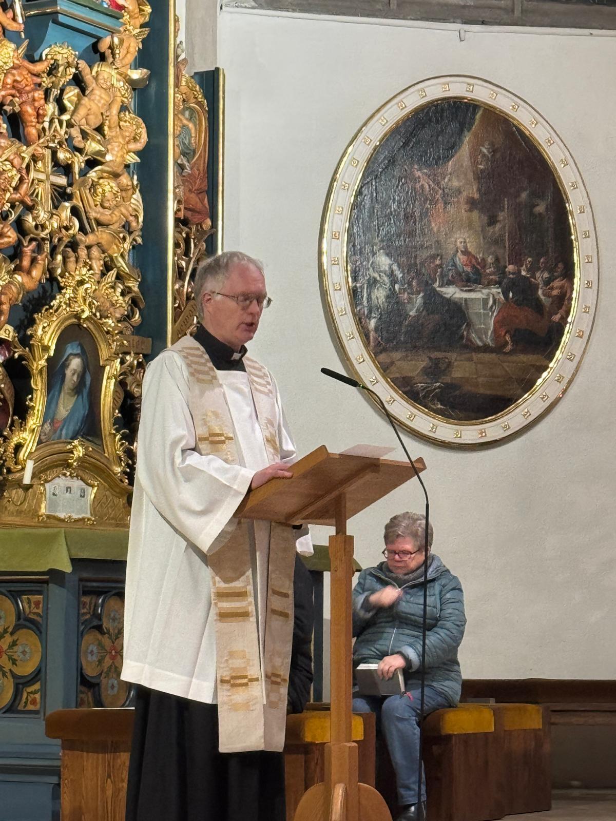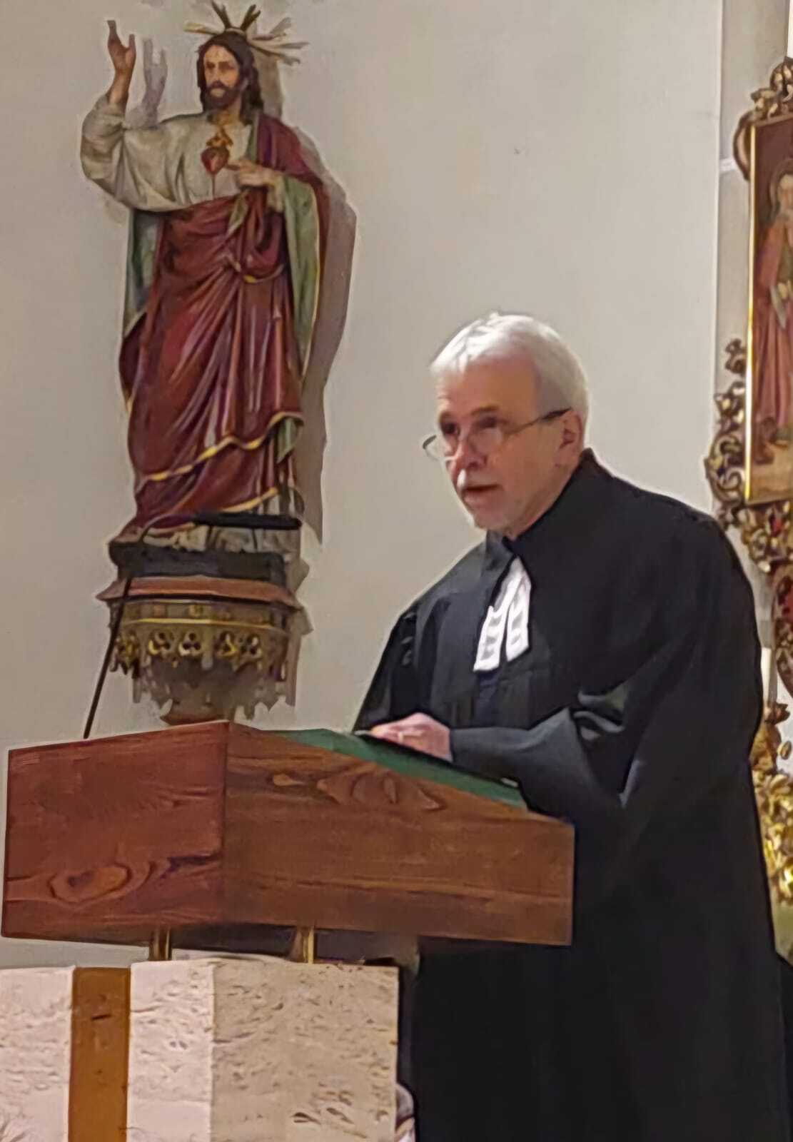 Das Evangelium für die Predigt war aus Johannes Kap. 20 Vers24-29, die Stelle wo der ungläubige Thomas beim Treffen der Jünger und Jesus, die Narben Jesus berührte und dann erst glaubt, an den Auferstandenen. Pfarrer Siegfried Kolck-Thudt vergleicht uns in seiner Predigt, mit Thomas und bezeichnet uns als ThomaseInnen in der heutigen Zeit, die aus verschiedensten Gründen glauben und nicht glauben und den Kirchen fernbleiben. Es ist ein schwieriger Prozess mit dem wir mit Geduld gehen müssen um eine gemeinsame Zukunft zu haben. Daher sollten wir–uns zur Zusammenarbeit bemühen, damit wir wo es Unterdrückung, Leid und Ungerechtigkeit gibt sie verhindern –mit Hoffnung in eine Welt, die von Streit und Zwietracht geplagt ist gehen und vertrauen sähen -das der Verstand, mit den unübersehbaren Forschungen, Glaube und Vertrauen zu einer gemeinsamen, friedvollen und lebenswerten Welt führt.