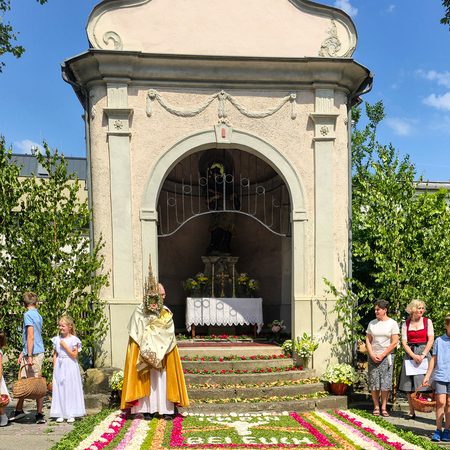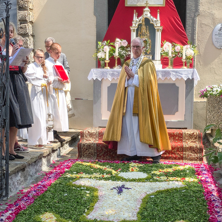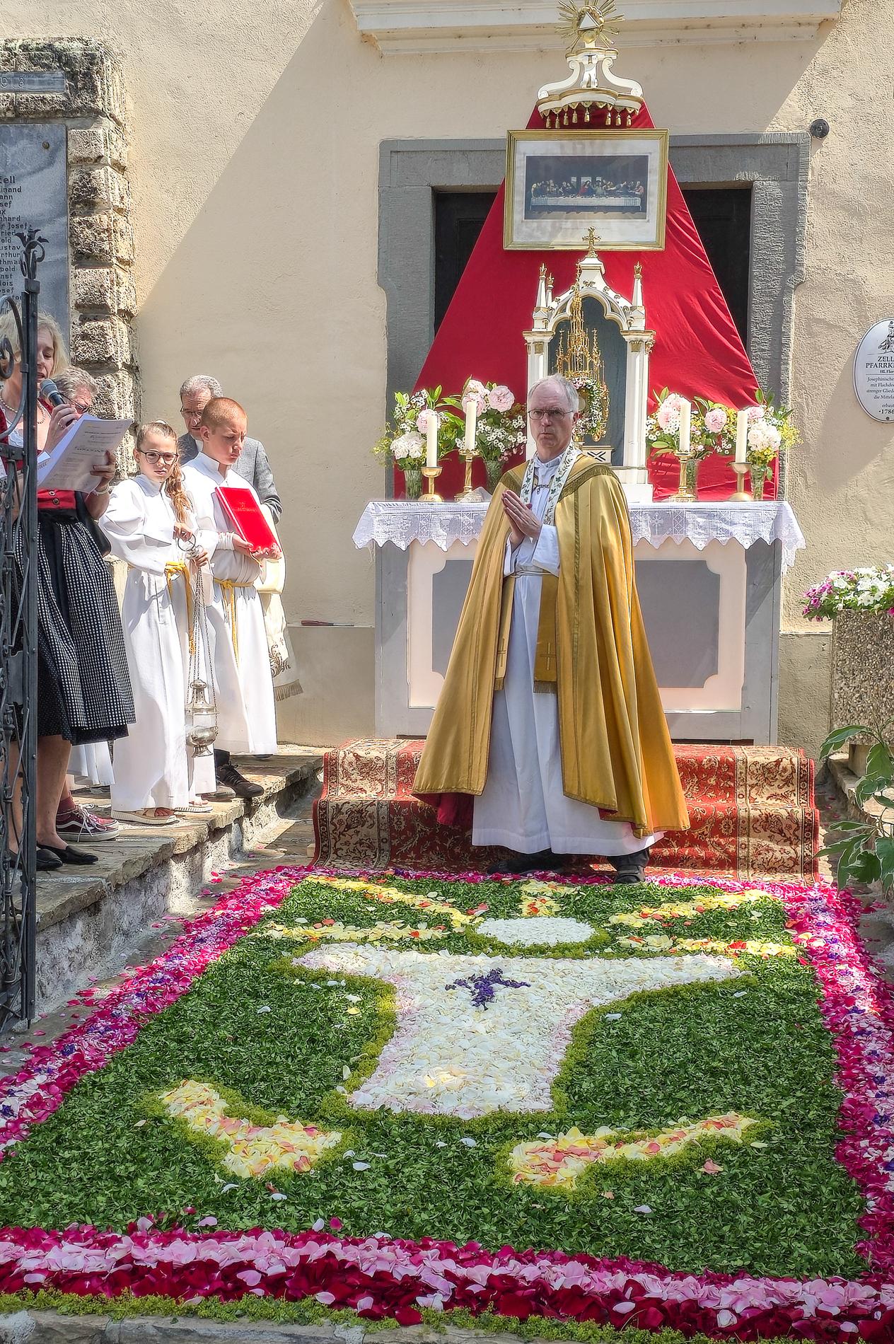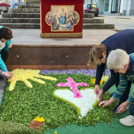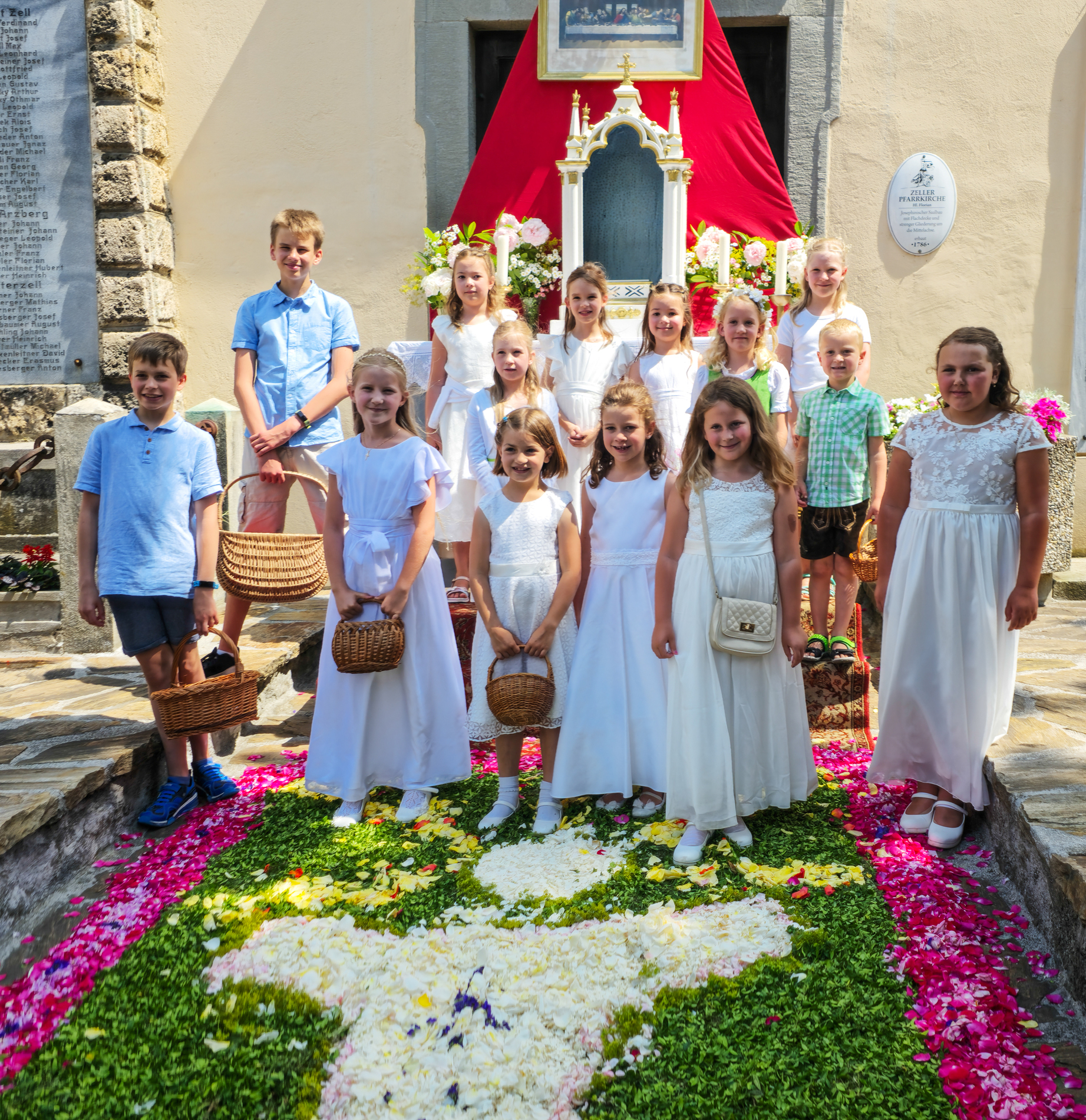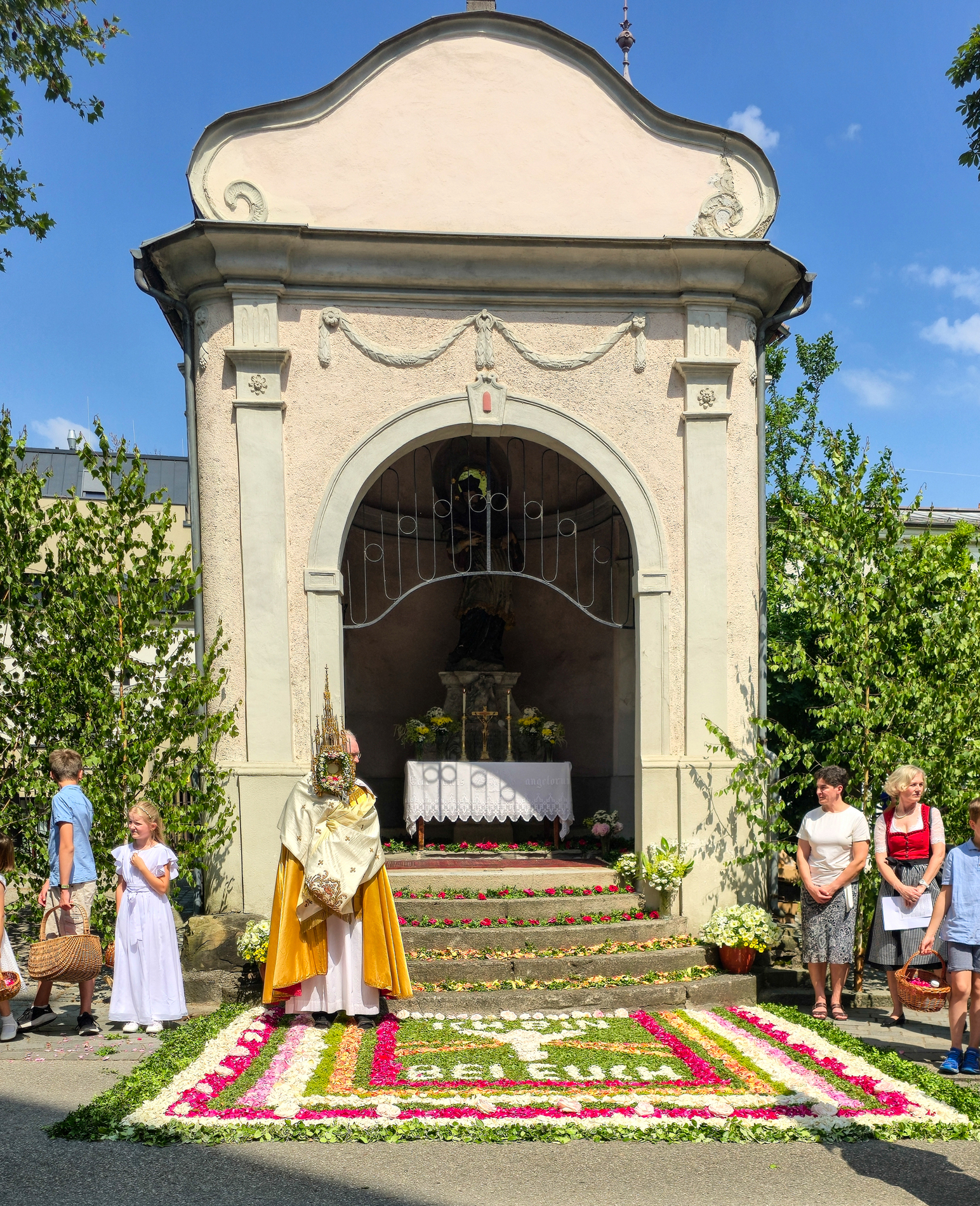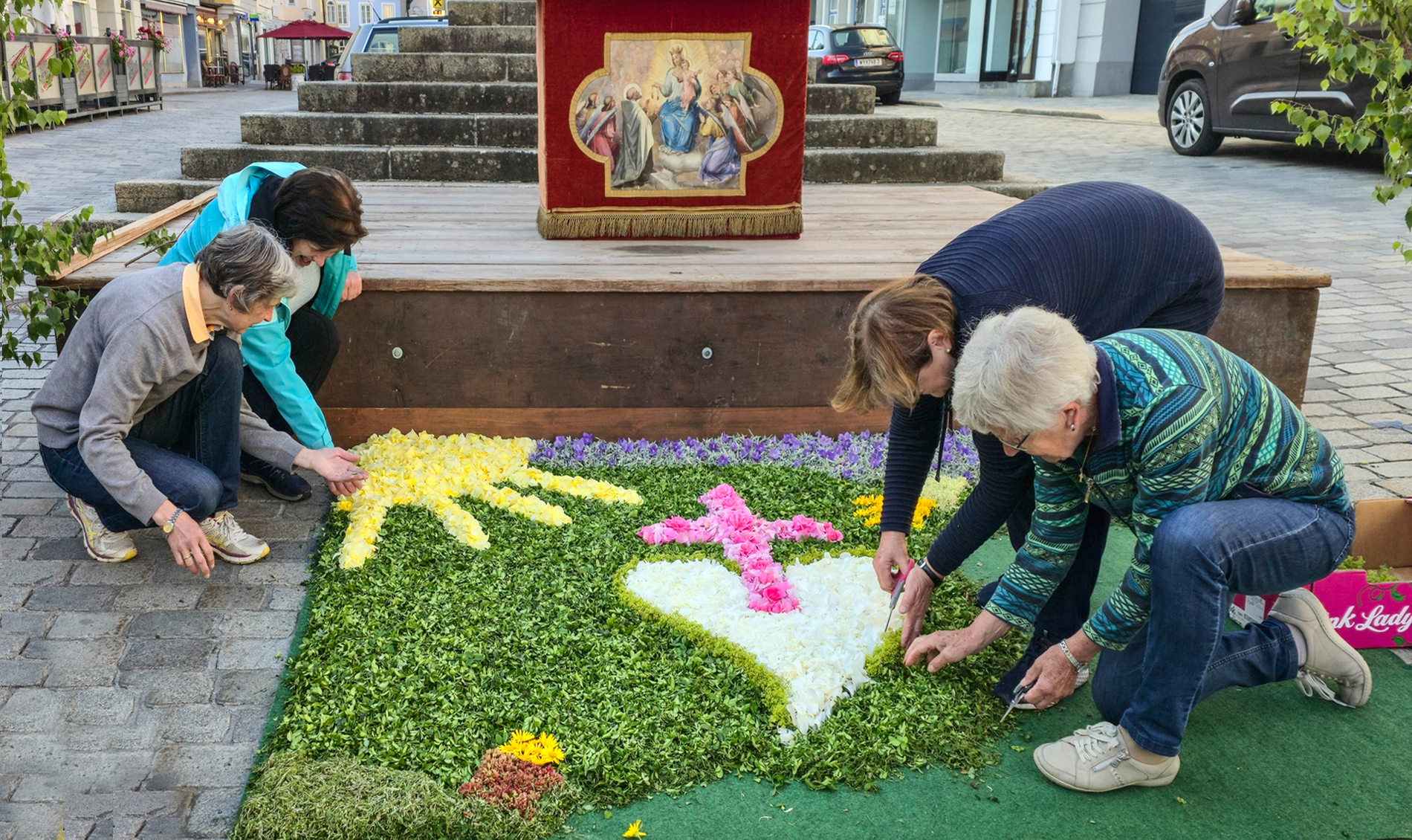 Die kunstvoll gestalteten Blumenteppiche bei den drei Altären waren auch heuer wieder ein beeindruckendes Zeichen gelebten Glaubens. Mit viel Liebe zum Detail und stundenlanger Vorbereitung wurden sie von engagierten Pfarrmitgliedern gelegt. Sie bildeten nicht nur den optischen Höhepunkt der Feierlichkeiten, sondern zeigten auch, wie tief diese Tradition in unserer Gemeinschaft verwurzelt ist.