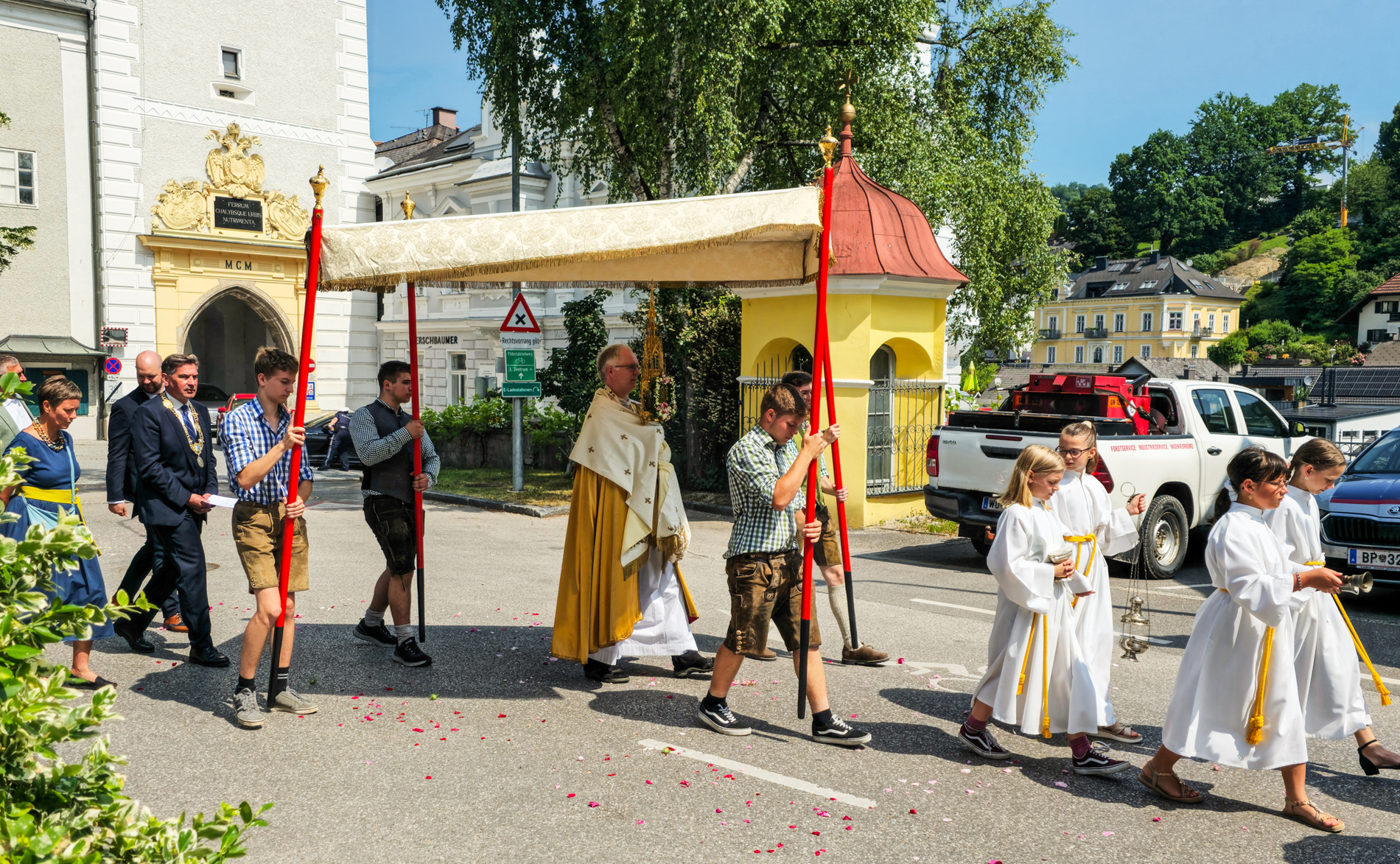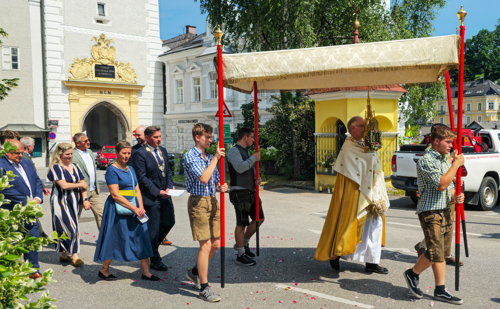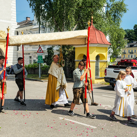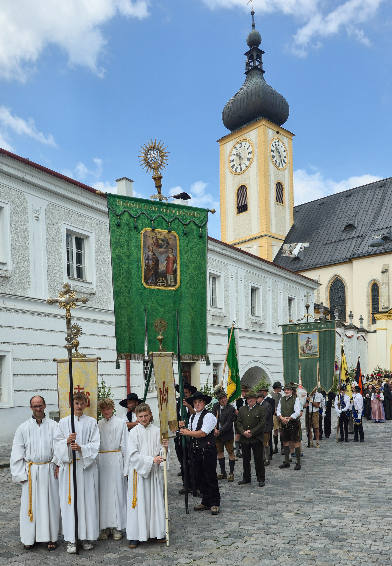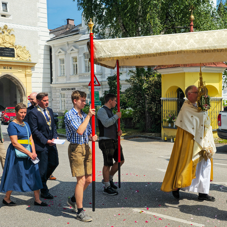 Bei strahlendem Sonnenschein zog die feierliche Prozession nach der Heiligen Messe von der Stadtpfarrkirche zunächst zur Mariensäule, weiter durch das Ybbstor zur Franziskuskirche und schließlich über die Zeller Hochbrücke zur Pfarrkirche Zell. Viele Erstkommunionkinder aus beiden Pfarren streuten unterwegs Blüten und verwandelten den Weg in ein buntes Blütenmeer. Den feierlichen Abschluss bildete die Segnung von Stadt und Land Waidhofen, bei der Bürgermeister Werner Krammer die Fürbitten vortrug.