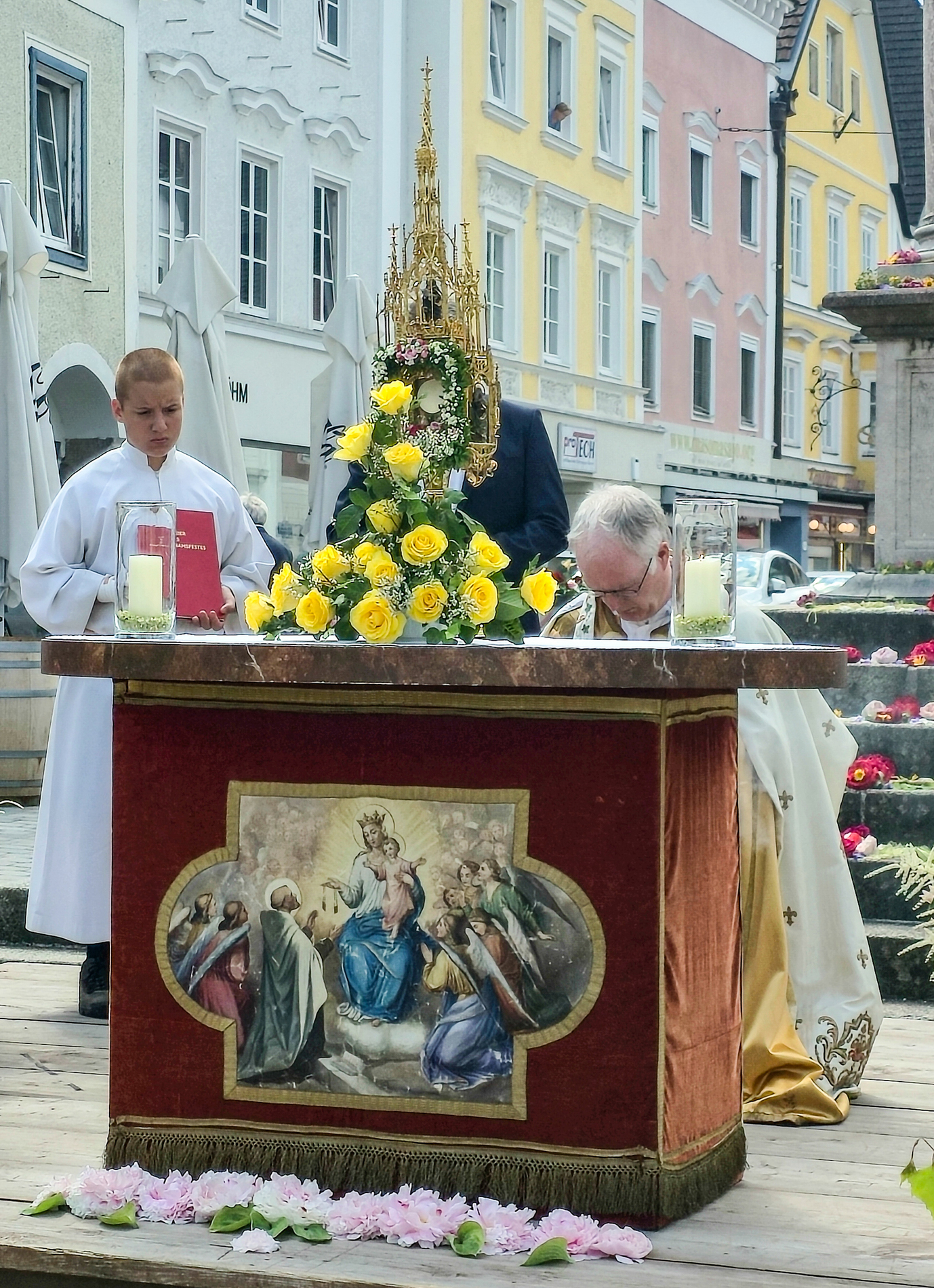 Ein besonderer Blickfang war wie immer die prachtvoll geschmückte Messerermonstranz.Sie war eigens für das Fronleichnamsfest aus dem Dommuseum in St. Pölten zurückgeholt worden, wo sie im heurigen Heiligen Jahr als Leihgabe ausgestellt ist. Rechtzeitig zur Feier kehrte sie nach Waidhofen zurück und strahlte in gewohntem Glanz.