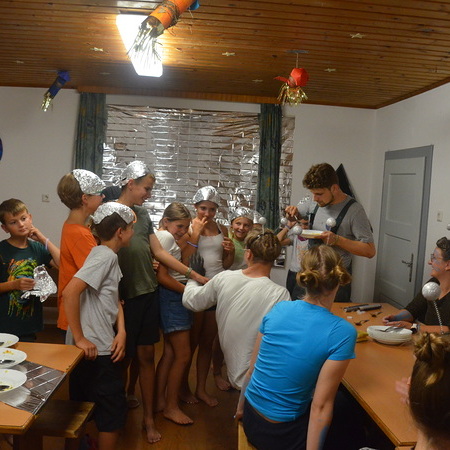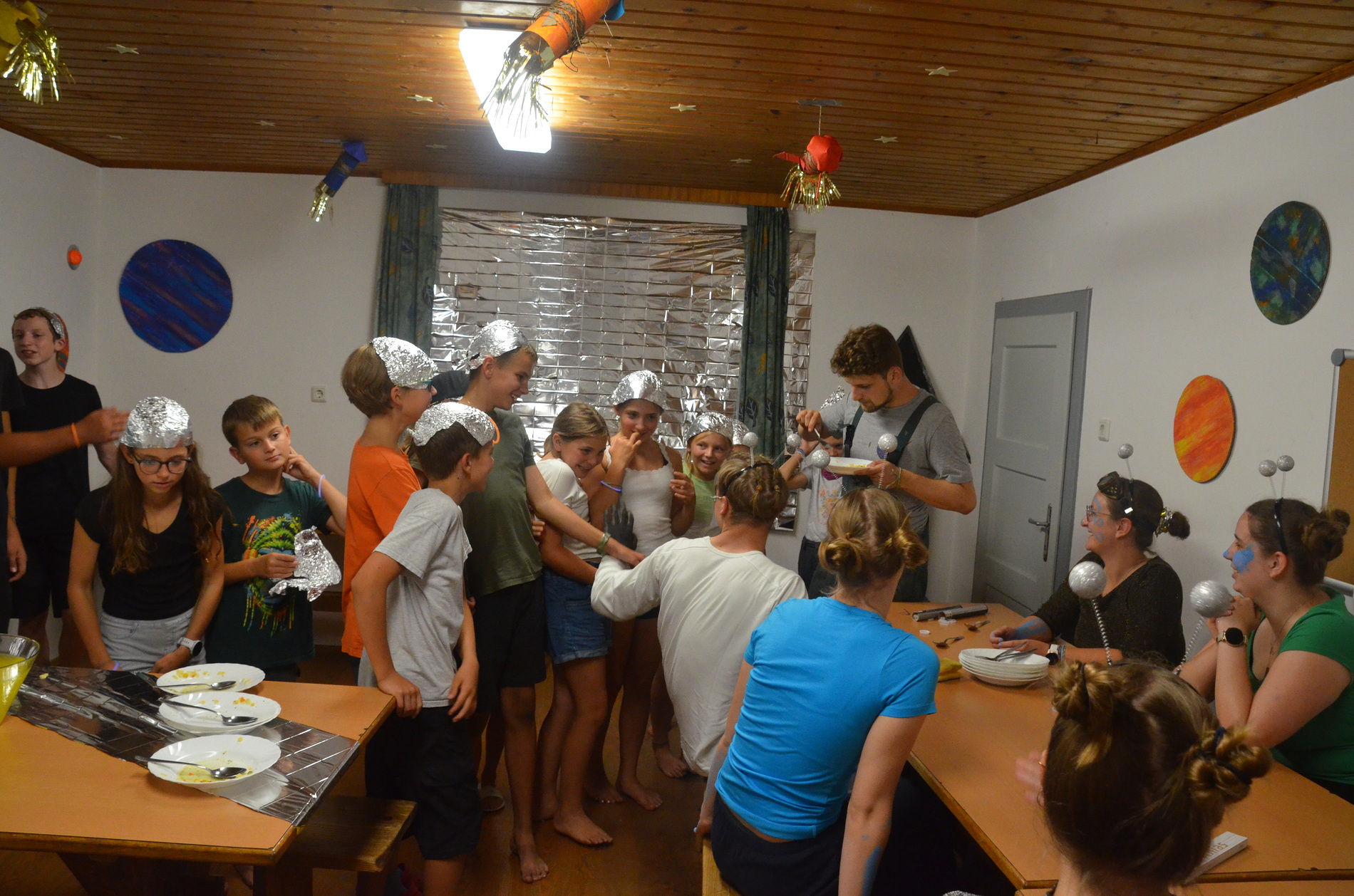 Diesmal ging es für die 16 Kinder und Jugendlichen mit ihren Betreuer*innen in die Steiermark, nach Hall bei Admont. Von dort aus startete die Reise ins Weltall. Unter dem Motto „Lost in Space“ erwartete die Ministrantengruppe eine Woche voller lustiger Spiele, leckerem Essen und spacigen Abenteuern. Ob Alienjagd, Astronautentraining oder Raumschiffbau, der Spaß war galaktisch. Auch Pfarrer Christian Poschenrieder lies es sich nicht nehmen, die Lagergruppe zu besuchen, um gemeinsam die Lagermesse zu feiern. Am Ende der Woche konnten die kleinen Astronaut*innen mit vielen Erinnerungen und Geschichten im Gepäck die Rückreise zur Erde antreten.