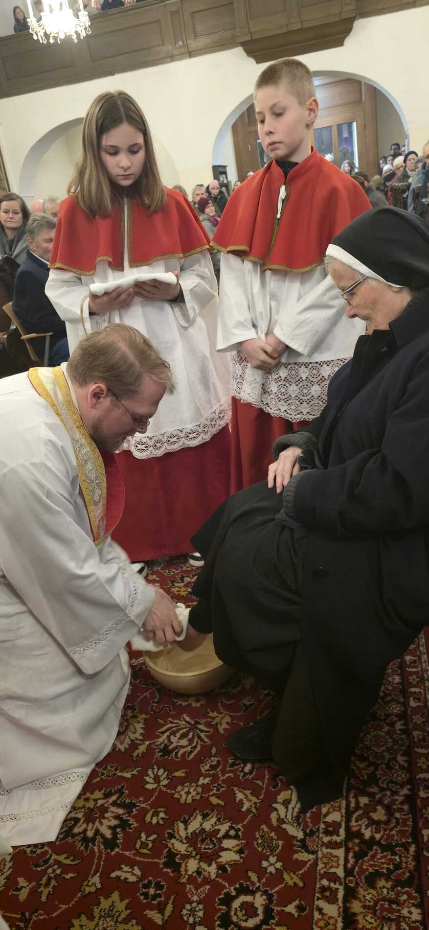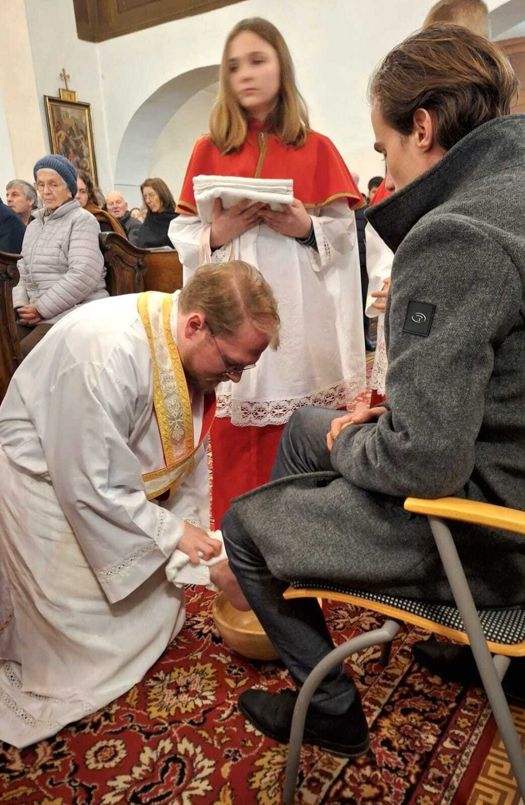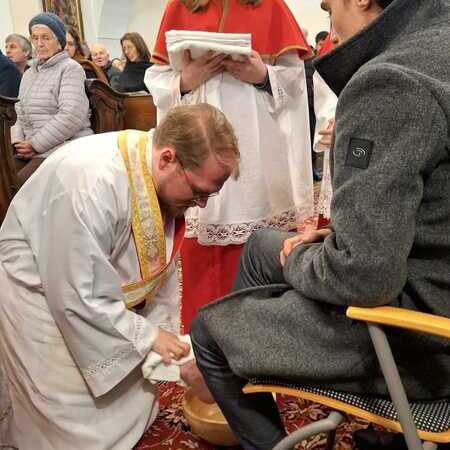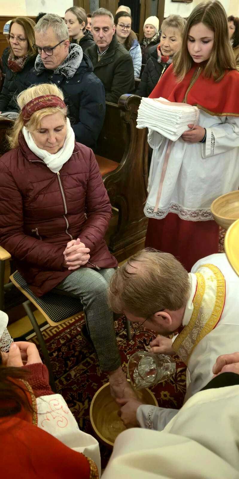 Um diese Botschaft auch sichtbar werden zu lassen, rief Kaplan Luca im Anschluss an die Predigt zwölf Personen aus den Bänken heraus, denen er die Füße wusch. Die Auswahl war bewusst vielfältig getroffen worden: Menschen unterschiedlichen Alters und aus verschiedenen Lebensbereichen sollten das ganze Volk Gottes repräsentieren.