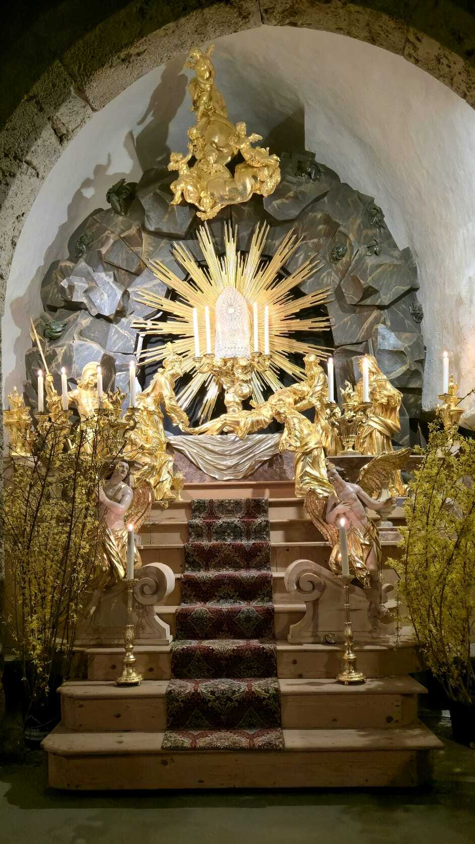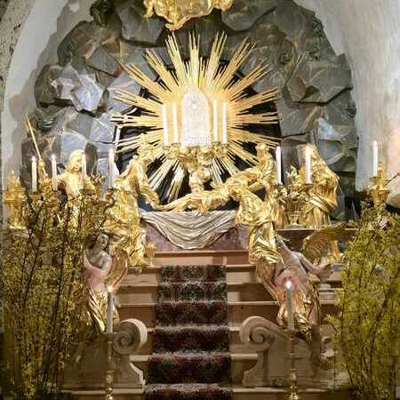 Im Anschluss an die Liturgie in der Kirche wurde das Allerheiligste in das Hl. Grab übertragen, wo die ganze Nacht die Gelegenheit bestand, das österliche Geheimnis, dass aus Leid und Tod neues Leben entsteht, betend zu meditieren.