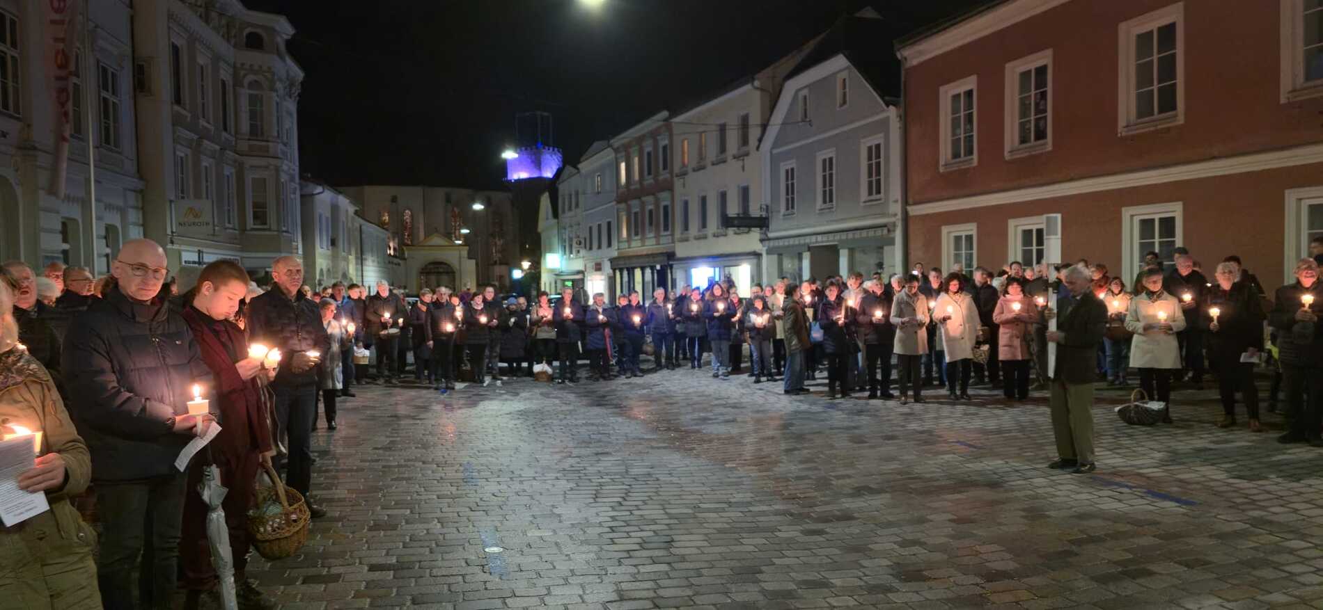 Mit der Segnung des Osterfeuers vor der Stadtpfarrkirche begann die Lichtfeier der Osternacht. An diesem Feuer wurde die Osterkerze als Symbol für Christus, das Licht der Welt, entzündet. Im Schein der Kerzen erklang dann in der Kirche das Exsultet – das große Osterlob – das die Freude über die Auferstehung verkündet. Anschließend wurde in mehreren Schriftlesungen aus dem Alten und Neuen Testament der Weg Gottes mit den Menschen in Erinnerung gerufen, der seinen Höhepunkt in der Auferstehung Christi findet.